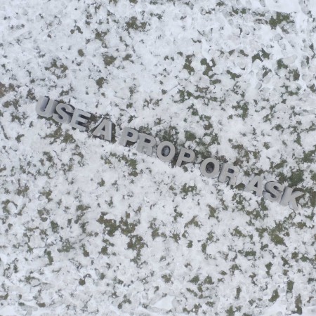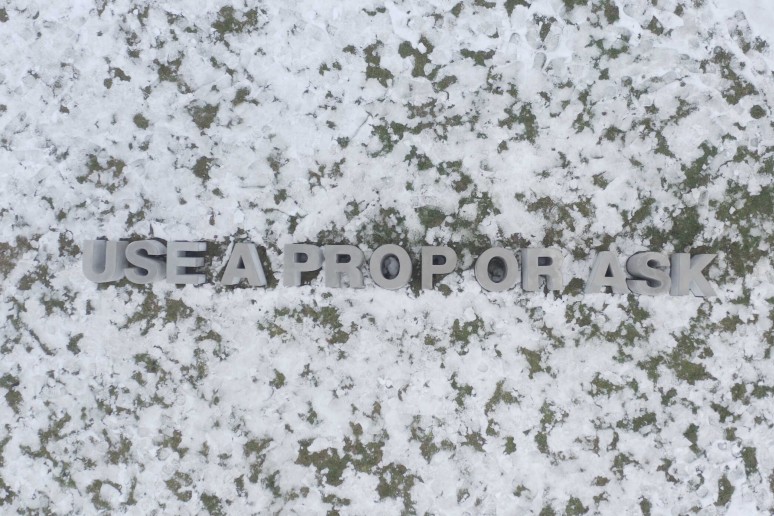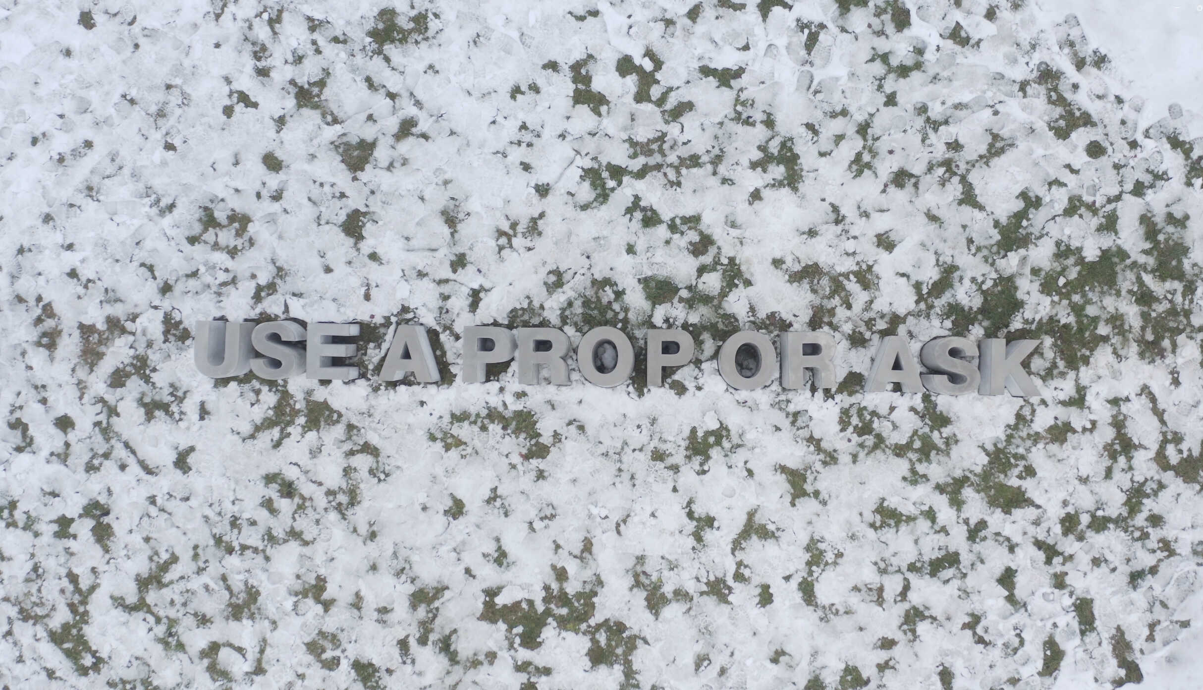 The concept of the piece is to create anagrams from the museum’s name EUROPOS PARKAS. Using its thirteen letters, Zamojski generates new meanings and words. The first anagram is USE A PROP OR ASK.
